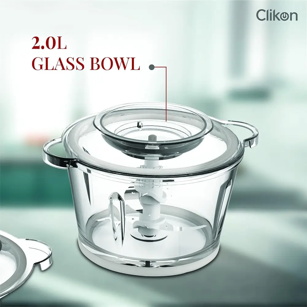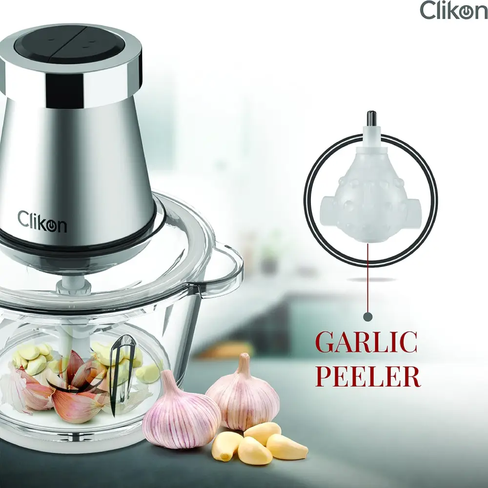CLIKON CHOPPER W/GARLIC PEELER CK2643 Powerful 350 watts motor allows you to chop, blend, puree, mix and mince a variety of ingredients quickly. More than just a meat chopper, Clikon’s CK2643 can be used to grind fruit, vegetables and meat. With the garlic peeler attachment, you can get rid of the skin at a press of a button. Match the motor with interface to lock the blade in the right place before use. Thermal protection device makes this device safe and safety switches will stop the motor from grinding once you release the button. The CK2643 is lightweight & a perfect size for everyday use in the kitchen & features Dishwasher safe parts. The transparent 2 Litre glass bowl allows you to easily see the chopped consistency & is equipped with anti-slip rubber mat to keep the device stable during it's operation.