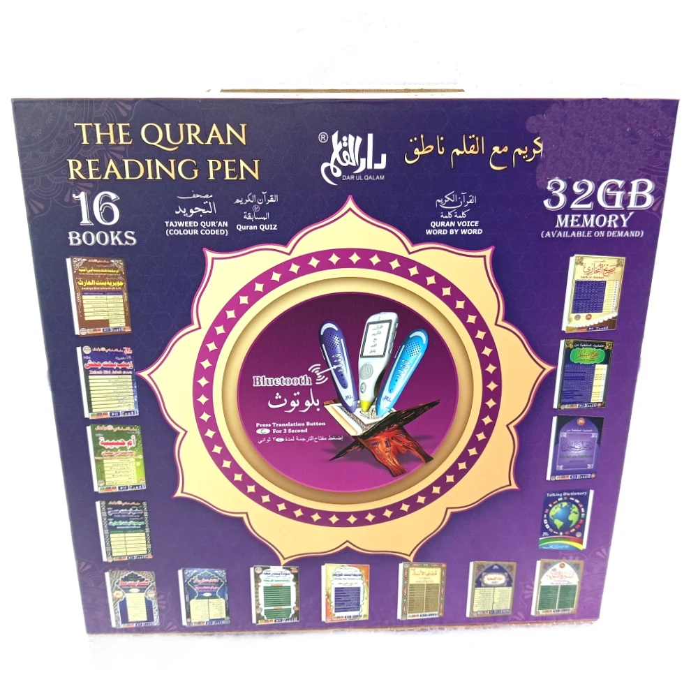 DARUL QALAM QURAN READING PEN 16 BOOKS QURAN VOICE WORD BY WORD BLUETOOTH SPEAKER 32 GB MEMORY 16 Books Preloaded: Comes with 16 different Quranic books, providing a variety of readings and translations. Quran Voice Word by Word: The pen reads the Quran aloud word by word, making it easier to follow along and learn pronunciation. Bluetooth Speaker: Equipped with a Bluetooth speaker, allowing you to connect the pen to external audio devices for clearer sound or to play Quranic recitations on other speakers. 32GB Memory: 32GB of memory ensures that the device can store a large number of Quranic resources and audio files. Additional Features: Portable Learning: The pen is compact and portable, making it easy to carry for studying or listening to Quranic recitations on the go. Ease of Use: Simply touch the pen to the desired text in the Quran or a book to hear the recitation of that verse. Learning the Quran: Great for beginners, students, or anyone looking to improve their recitation