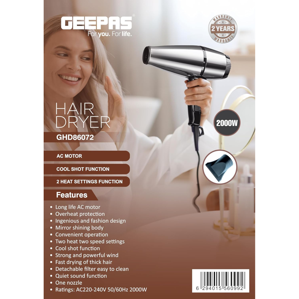 GEEPAS HAIR DRYER 2000W GHD86072 ONE NOZZLE, FAST DRYING Featuring a powerful and long-lasting 2000W motor, this hair dryer delivers strong airflow for efficient drying. It carefully dries even thick hair while protecting it from heat damage, allowing for controlled styling that stays in place all day. Its compact design ensures quick drying results every time. COOL SHOT FUNCTION The cool shot feature tightens hair cuticles, creating a smooth, frizz-free finish that lasts. Suitable for all hair types, it helps set hairstyles in place, ensuring they remain neat and polished throughout the day. 2 SPEED AND 2 HEAT SETTINGS With adjustable heat and speed options, you can customize your blow-dry experience to suit your hair type. Finish with the cool shot button for ultra-glossy hair that stays styled from morning to night. SAFETY PROTECTION Equipped with overheat protection, this hair dryer automatically shuts off if the temperature exceeds safe levels, ensuring convenient and safe operation.