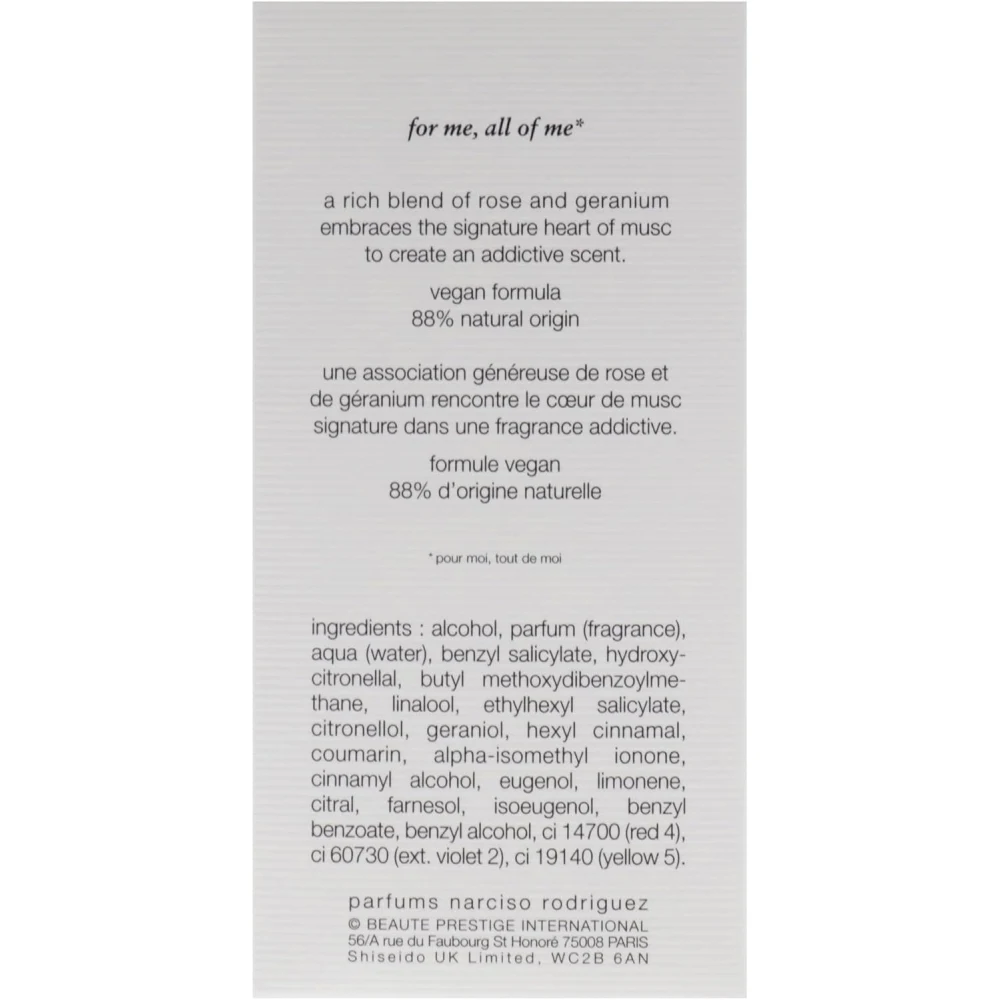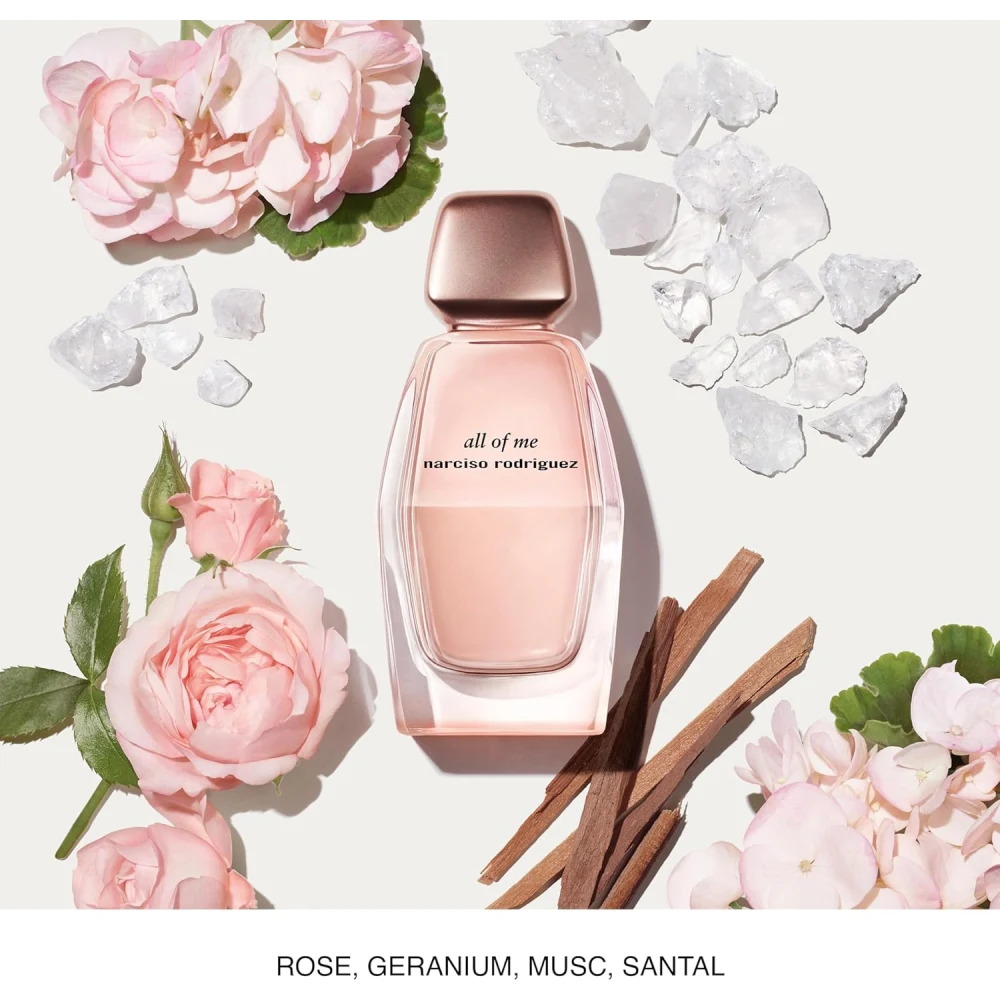 NARCISO RODRIGUEZ ALL OF ME EAU DE PARFUM (EDP) 90 ML Narciso Rodriguez All of Me Eau de Parfum is a sophisticated fragrance that captures a blend of elegance and sensuality. Here are some key details about the 100 ml version: Fragrance Profile Fragrance Family: Floral and woody, offering a modern and romantic scent. Top Notes: Typically features fresh and vibrant notes, such as pear and bergamot, providing a bright opening. Middle Notes: The heart often includes a rich blend of floral notes, like jasmine and orange blossom, enhancing its femininity. Base Notes: Generally anchored by warm notes like musk and cedarwood, adding depth and a lingering finish. Longevity Known for its lasting power, making it suitable for both daytime and evening wear. Packaging The bottle usually has a sleek and elegant design, reflecting the modern aesthetic of Narciso Rodriguez.