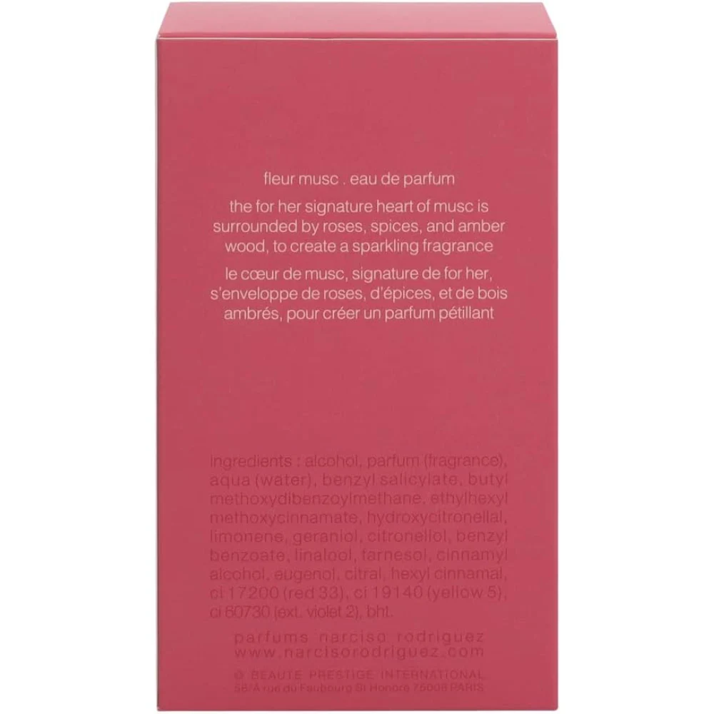 NARCISO RODRIGUEZ FLEUR MUSC FOR HER EAU DE PARFUM (EDP) 100 ML Narciso Rodriguez Fleur Musc for Her Eau de Parfum is a vibrant and elegant fragrance that beautifully balances floral and musky notes. Here are the key details about the 100 ml version: Fragrance Profile Fragrance Family: Floral and musky, with a modern and feminine twist. Top Notes: Often features bright notes like pink pepper and bergamot, providing a fresh and lively opening. Middle Notes: The heart typically includes rich floral notes, such as rose and peony, adding depth and a romantic touch. Base Notes: Anchored by warm notes of musk and amber, which create a sensual and lasting finish. Longevity Known for its good staying power, making it suitable for both everyday wear and special occasions. Packaging The bottle usually has a sleek, elegant design, reflecting the sophisticated nature of the fragrance.