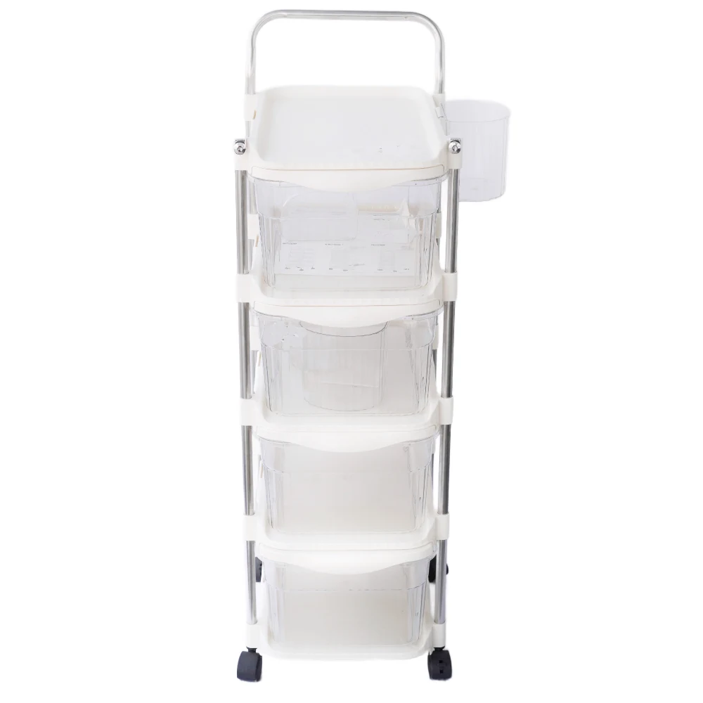 DP 4 LAYER GLASS ORGANIZING DRAWER WITH WHEELS The DP 4 Layer Glass Organizing Drawer with Wheels is a sleek, four-drawer storage unit made with glass and equipped with wheels for easy mobility. It provides a stylish and practical way to organize small items while allowing you to move it around effortlessly. This type of storage unit is ideal for spaces where aesthetics and functionality are both important, such as living rooms, offices, or bedrooms. The glass material gives it a modern, transparent look, making it easy to see the contents inside.